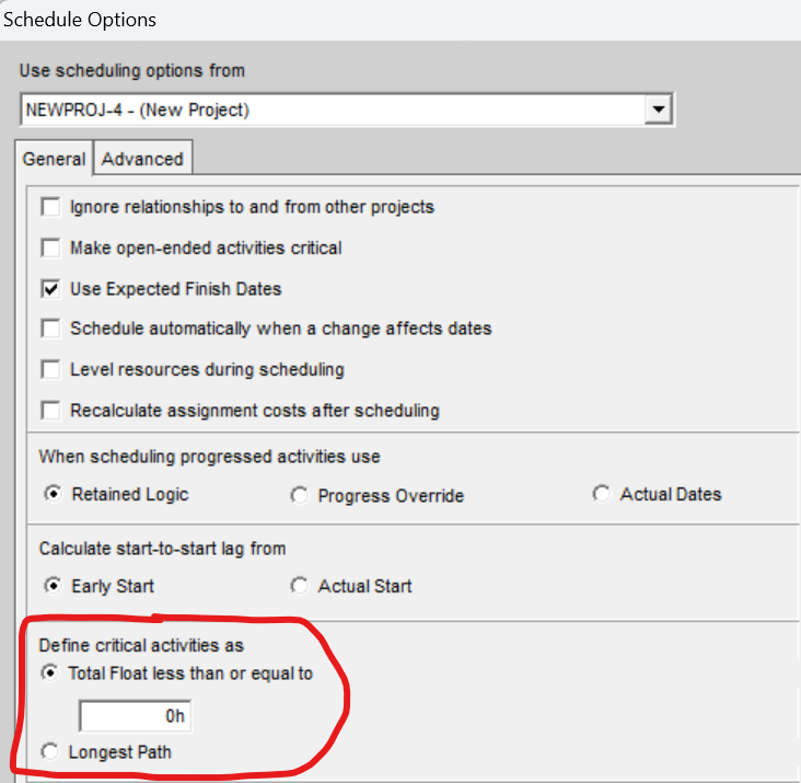 Definition: It consists of activities that have a total float amount of less than or equal to zero. Although the total float amount that determines the criticality threshold can be customized inside Primavera P6 under the scheduling options (refer to the below snapshot), zero is the industry standard.
