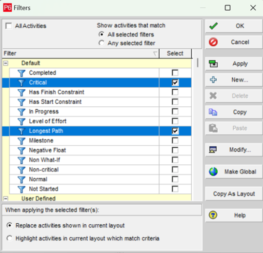 Many planning engineers experience confusion regarding the difference between the longest path and the critical path. This article explains the definition, focus and use case for both. A spoiler alert: the longest and critical paths are not the same. In fact, the longest and critical paths are different to the extent that P6 offers separate filters, columns, grouping and presentation for both. The difference is more prominent in the schedule updates during the project execution as demonstrated in the below image. When a schedule update is completed, critical paths can be generated whereas the corresponding scope of each path is completed beyond the contract completion date. This dynamic is better analyzed through a multiple float paths framework. On the other hand, the “Longest Path” is the longest sequence of activities among other competing critical paths. This path is what drives the forecasted completion date and is driven by the dominant cause of the overall project delays. The below image is for demonstration purposes only as you might have more critical paths in your project.