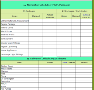 - Area-wise indicators (e.g. concrete, finishes, etc)